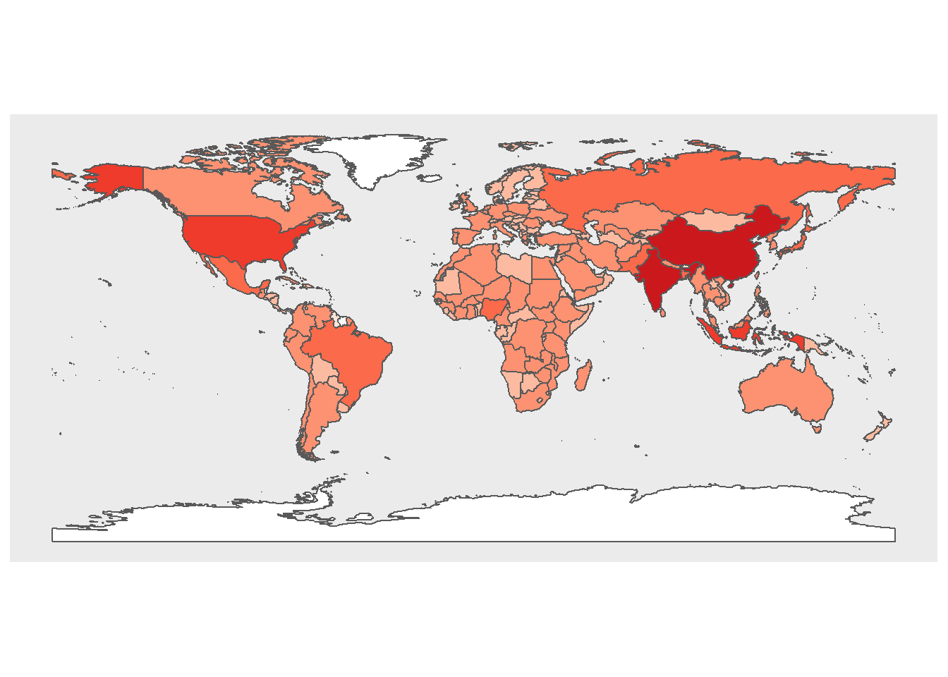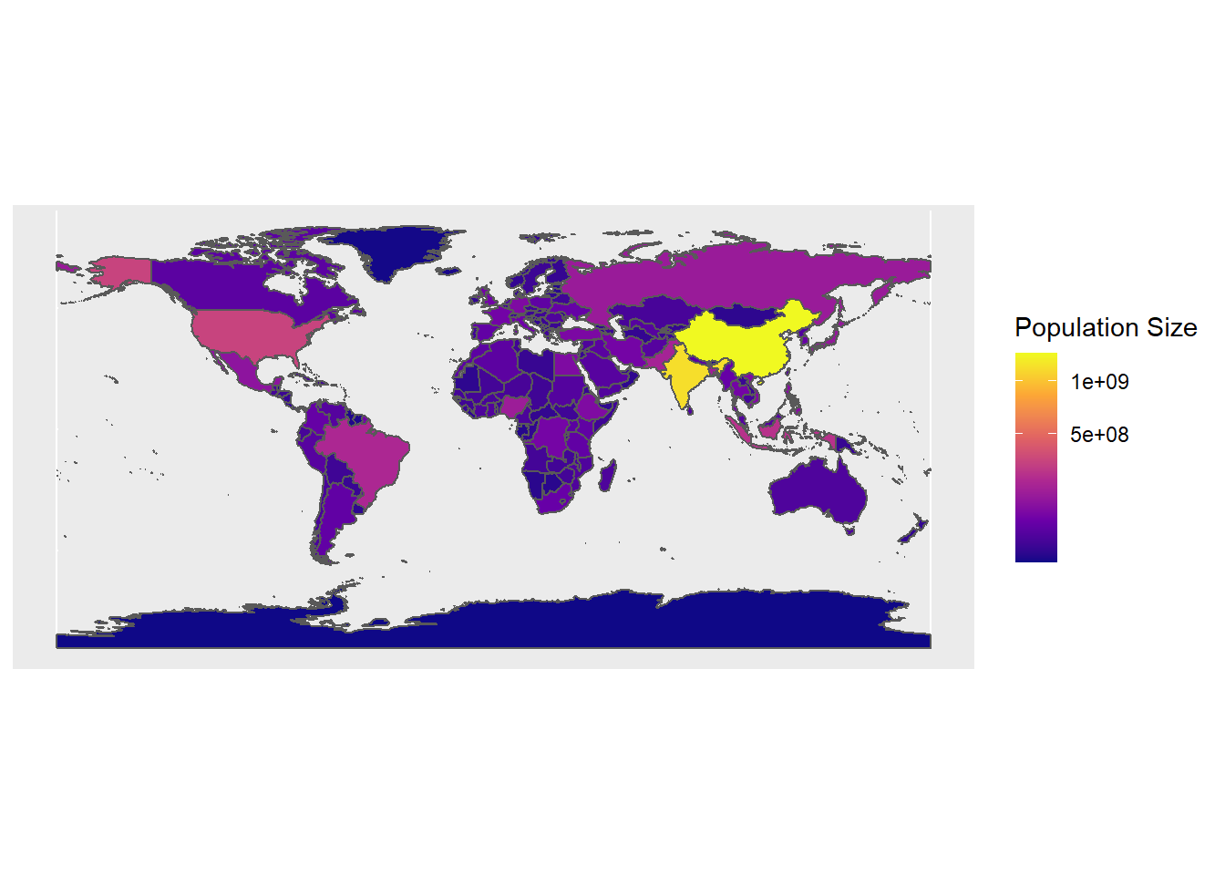 We use the data provided in the rnaturalearthdata and rnaturalearth packages, which contain information about the population size of countries, to color code and thus visualize differences in population size by country